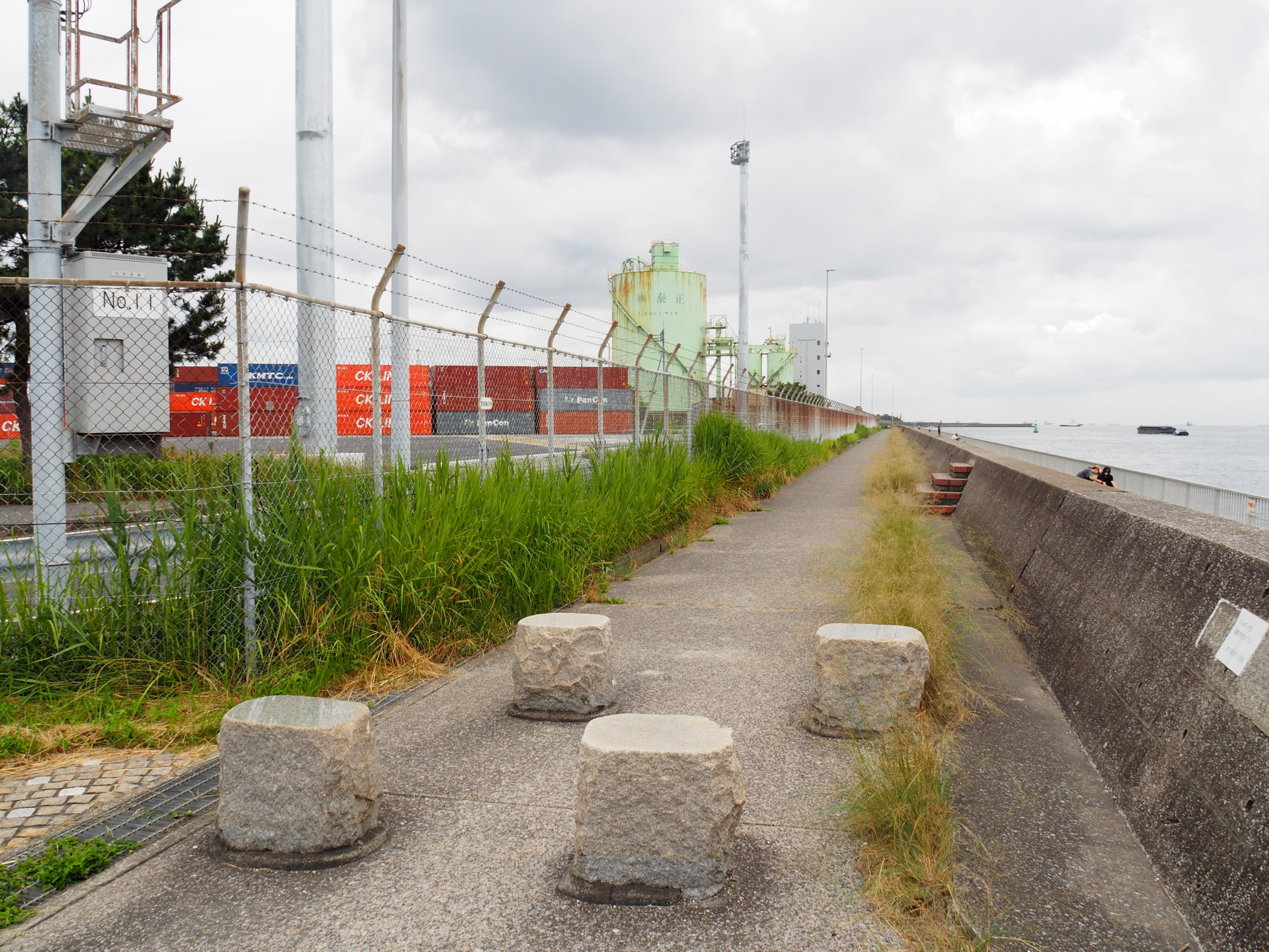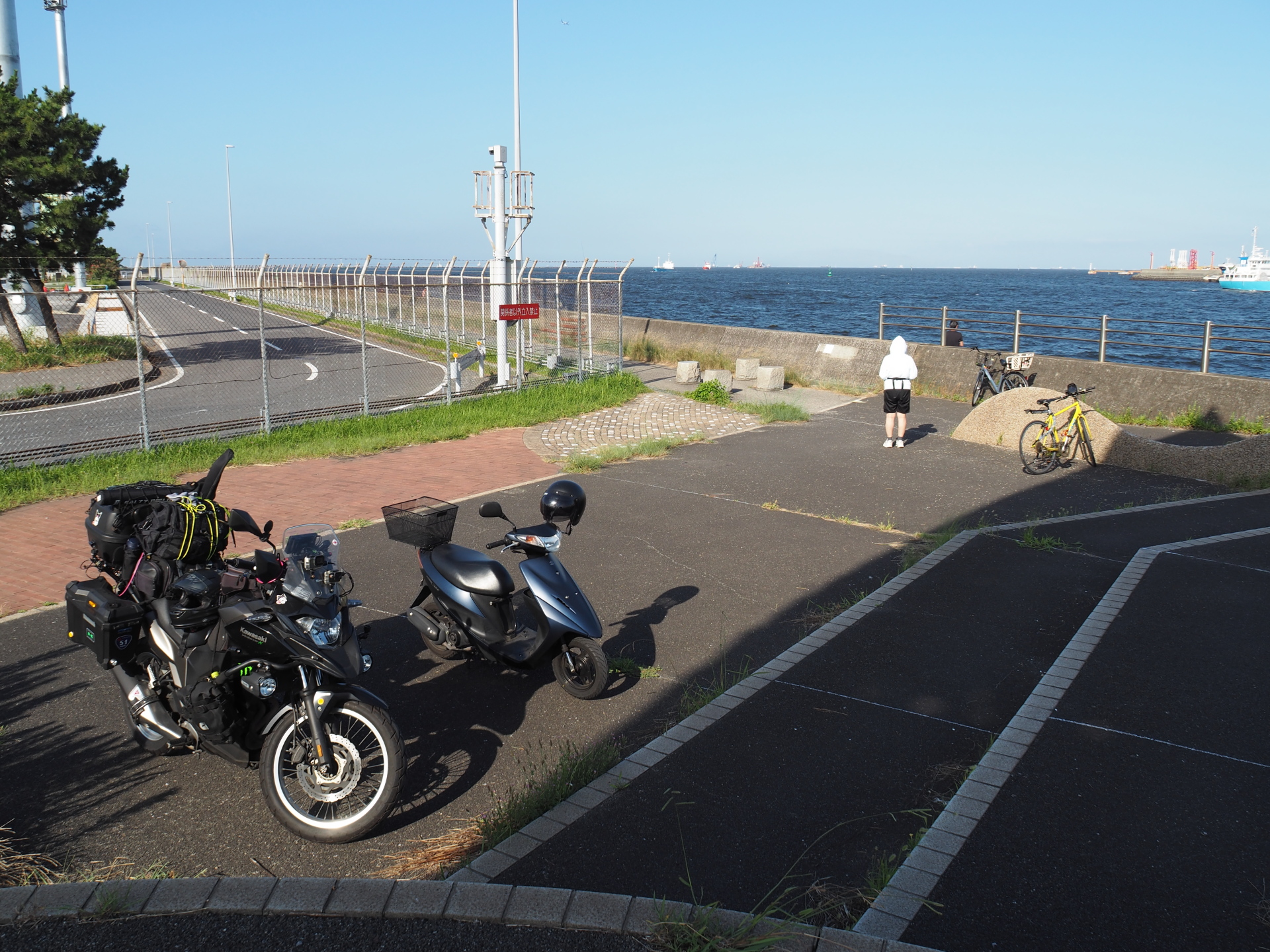 車は千葉中央埠頭パーキングに止められる。付近に飲食店はないが、入口に自販機が一台ある。バイクなら埠頭に隣接するシーガル広場まで入って行ける。通常はそこに止めるが、その気になれば車止めの石の間をすり抜けて埠頭の端までバイクで入っていける。