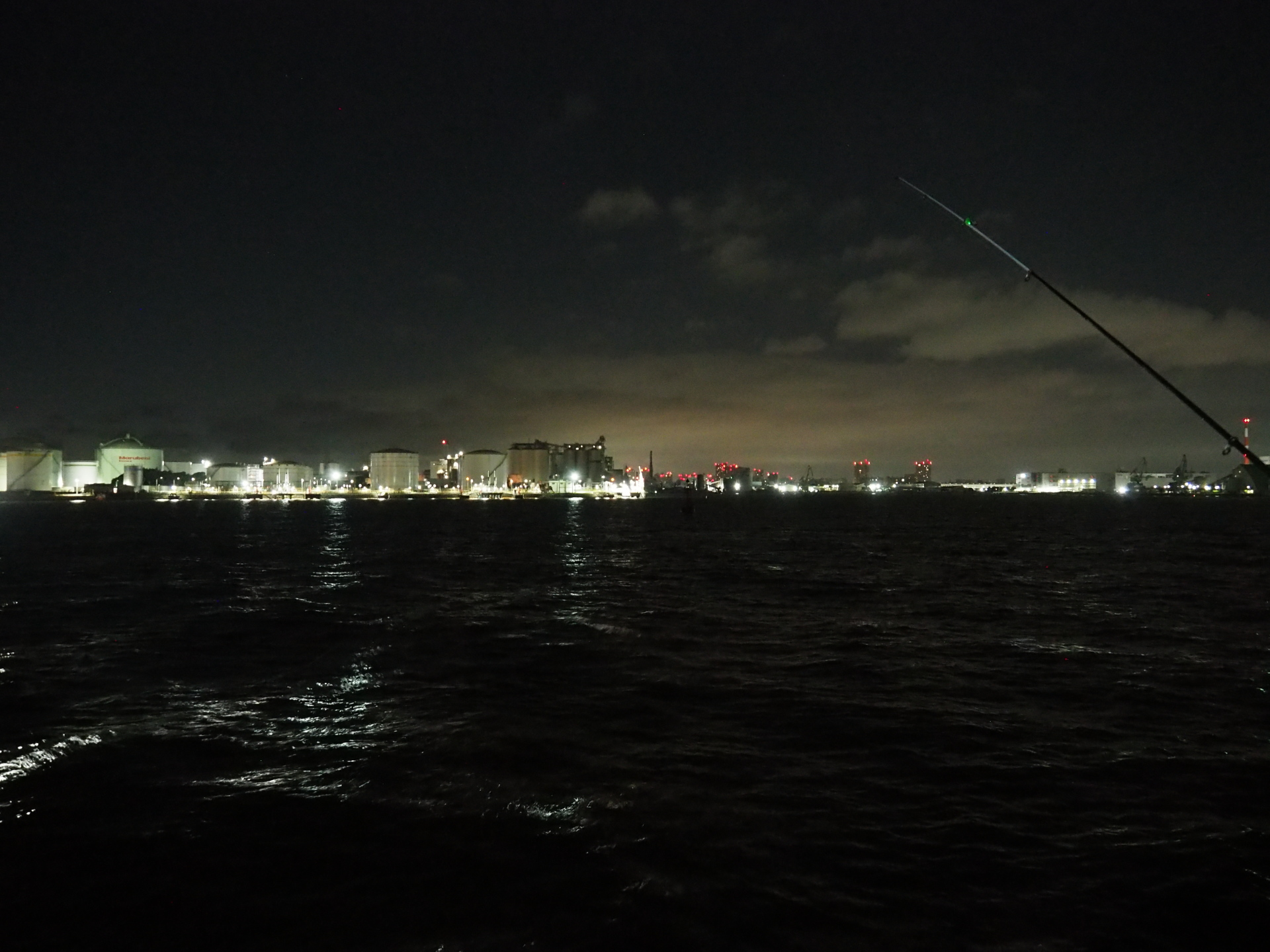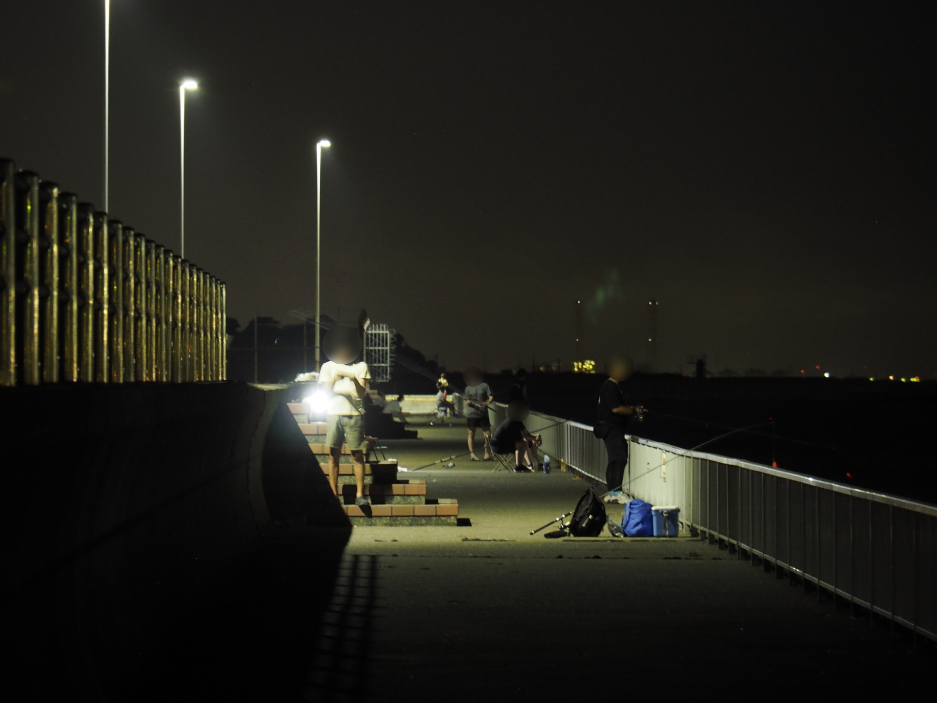 埠頭の左側は照明があるので夜釣りに向いている。右側は何もなく真っ暗なので釣りするには少し勇気がいる。幸いフェンスがあるので海へ落ちる心配はないが、波が荒い時は不安になる。夏は暑いので夜釣りの方が人が多い。向かいに見える石油ターミナルの夜景が綺麗だ。
