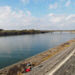 埠頭の右側はアジ釣りのファミリー層、左側はクロダイ狙いのベテラン釣師が多い。ウィークポイントは岸から5m先のカケアガリ。遠くに飛ばす必要はない。背後に波返工やフェンスがあるので長い釣竿だと取り回しが大変。埠頭は高さがあるので並のタモ網では届かない。
